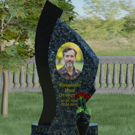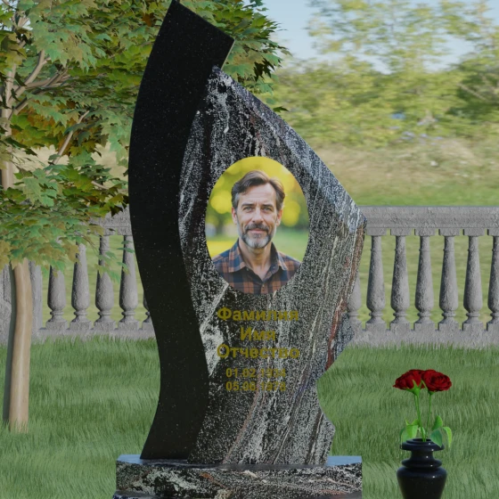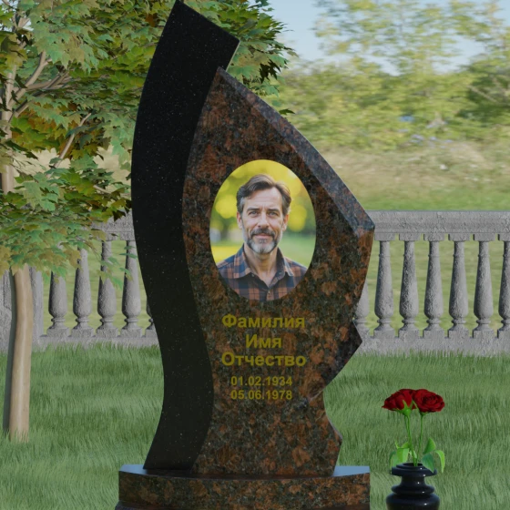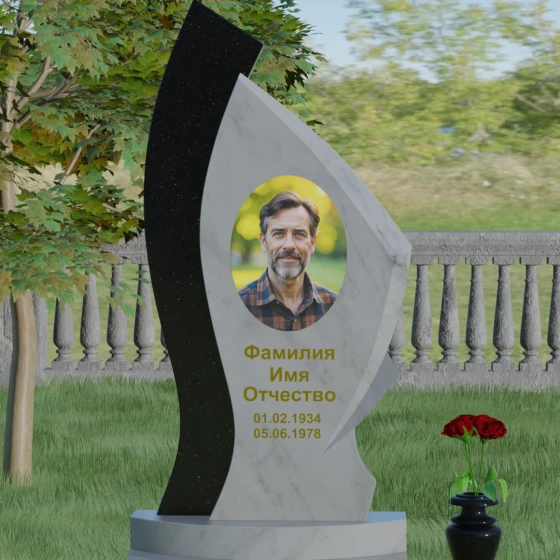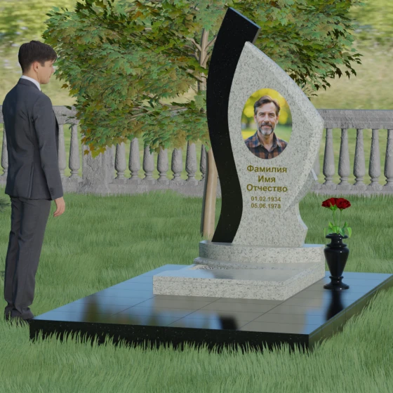 Форма этого памятника глубоко символична. Асимметрия олицетворяет жизненный путь — не всегда ровный, но всегда уникальный. Сочетание двух разных пород камня в одной стеле символизирует неразрывную связь души и тела, земного и вечного. Плавный изгиб верхней кромки напоминает защитное крыло или тихую волну памяти, уносящую печаль, оставляя лишь светлые воспоминания. Этот монумент внушает чувство покоя и защиты, словно оберегая покой ушедшего своей массивной и надежной конструкцией.