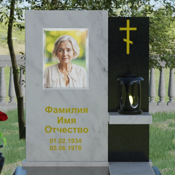 Кому подойдет: Данная модель является универсальной благодаря своему лаконичному и одновременно глубокому дизайну. Она станет достойным выбором как для мужчины, так и для женщины. Строгость линий и золотые акценты подчеркнут статус и мужество, а плавные изгибы верхней грани привнесут нотки женственности и нежности. Этот мемориал выбирают те, кто хочет выразить глубокое уважение и создать на кладбище место, преисполненное достоинства и тишины, где каждый элемент — от лампады до фактуры камня — говорит о вечной любви.