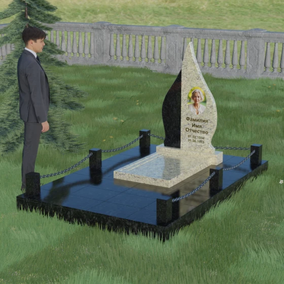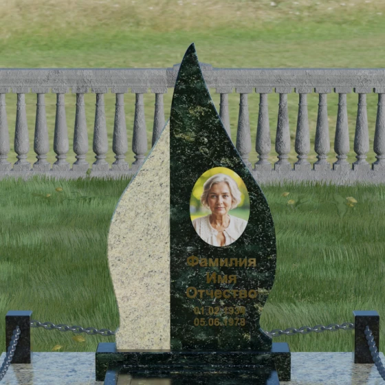Выбор мемориального изделия — это всегда глубоко личный процесс, стремление выразить в камне ту нежность и уважение, которые мы храним в сердце. Модель 018 воплощает в себе гармонию и завершенность. Величественная стела выполнена в форме изящного, стремящегося ввысь пламени или капли, что символизирует вечный свет души и неугасаемую память. Асимметричная геометрия с мягкими, плавными изгибами лишена острых углов, что подчеркивает идею спокойствия и вечного упокоения. Особое внимание привлекает сочетание двух контрастных видов камня: светлая левая часть стелы с её благородной зернистой фактурой мягко огибает темную зеркальную сердцевину. Этот контраст создает визуальный объем и глубину, подчеркивая уникальность композиции и делая её заметной на фоне традиционных строгих форм.