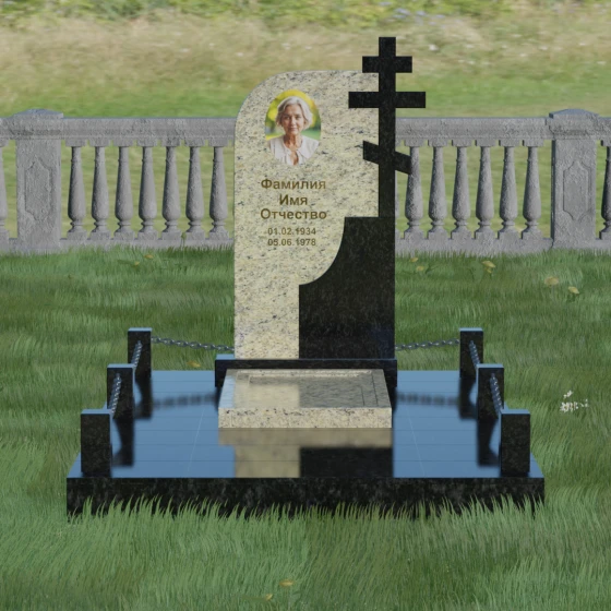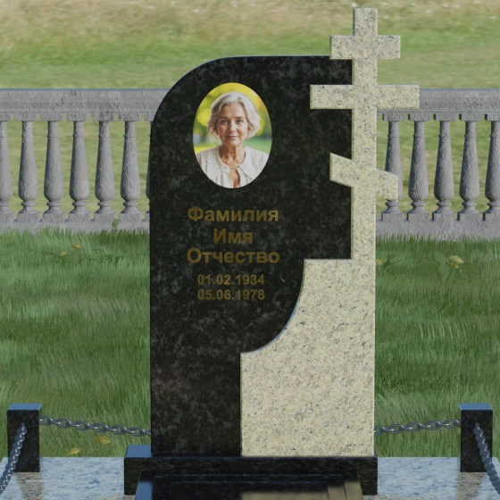 Игра контрастов — главная эстетическая особенность этого изделия. Сочетание глубокого темного камня с зеркальной полировкой и более светлого, фактурного гранита создает визуальный объем и подчеркивает торжественность момента. Такая форма идеально подходит для выражения скорби через красоту и долговечность. Плавные линии резьбы на переходе между элементами напоминают о том, что память о человеке не имеет острых углов, она течет сквозь время, оставаясь неизменной и чистой.