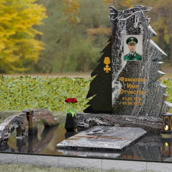 Надгробие из натурального камня (Артикул 202) — это монументальная композиция, созданная для того, чтобы увековечить память о человеке чести, чья жизнь была неразрывно связана с небом и служением отечеству. Архитектурное решение стелы поражает своей динамикой и символизмом: в верхней части монумента застыл в стремительном взлете силуэт современного истребителя, выполненный с ювелирной точностью. Левая грань памятника решена в виде резных, асимметричных выступов, напоминающих ветви северной ели или ломаные линии скалистого утеса. Такая геометрия придает мемориалу мужественный, волевой характер, подчеркивая стойкость и твердость духа ушедшего. Игра ломаных линий и острых углов создает ощущение мощи, которое невозможно передать в классических прямоугольных формах.