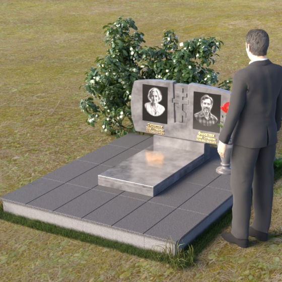 Геометрия модели тщательно продумана. Верхняя часть стел имеет скругленные углы, смягчающие строгость линий и придающие композиции более человечный облик. Между портретами выгравирован лаконичный православный крест, напоминающий о духовности и вере. Основание стел переходит в горизонтальную плиту, образуя единую плоскость с надгробной плитой. Надгробная плита выполнена в виде прямоугольника с полированной поверхностью, отражающей небо и окружающий мир. У основания композиции располагается аккуратная ваза из черного гранита, предназначенная для живых цветов, как символ непреходящей любви и уважения.