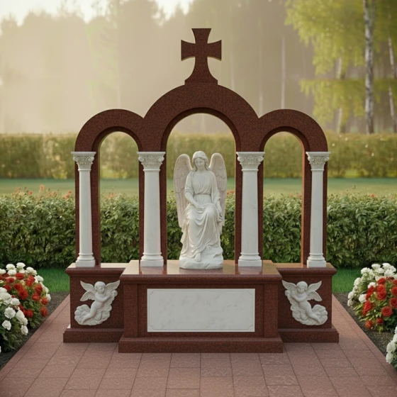 Кому подойдет: Эта мемориальная композиция идеально подойдет для тех, кто ищет не просто надгробный знак, а настоящее произведение мемориального искусства, способное выразить глубокую скорбь и вечную любовь. Она станет достойным воплощением памяти о человеке, чья жизнь была наполнена светом, верой и достоинством. Величественная аркада, символизирующая переход в иной мир, и фигура ангела, олицетворяющая чистоту души, делают эту композицию идеальным выбором для увековечения памяти о близком человеке, чья жизнь оставила неизгладимый след. Мемориальная композиция ПН 044 доступна для заказа в 8 цветовых решениях, что позволяет подобрать материал, наиболее точно отражающий характер и индивидуальность усопшего. Вы можете выбрать один из семи видов гранита: гранит Амфиболит с его глубоким черным цветом, величественный Балтик Грин, благородный Блю Перл, классический Габбро-диабаз, теплый Дымовский, изысканный Лезниковский или светлый Мансуровский. Также доступен мрамор Тассо, который придаст композиции особую нежность и утонченность. Такой широкий выбор материалов дает возможность создать по-настоящему уникальный и персонализированный мемориал, созвучный духу и памяти усопшего.