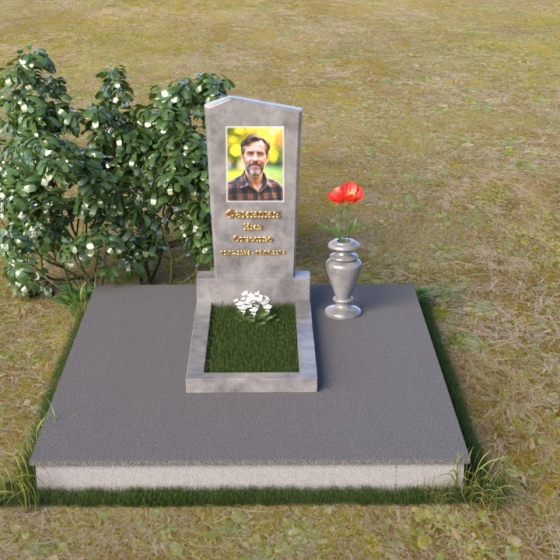 Этот гранитный монумент представляет собой композицию из двух основных элементов: вертикальной плиты с портретом и горизонтальной накладки. Вертикальная плита, возвышающаяся над землей, имеет строгую прямоугольную форму с небольшим скосом в верхней части. Это придает монументу сдержанную элегантность. Зеркальная полировка поверхности отражает свет, создавая ощущение глубины и сияния. На плите выгравирован портрет усопшего, выполненный с высокой точностью и вниманием к деталям. Ниже портрета располагается надпись с именем и датами жизни, выполненная золотым шрифтом. Горизонтальная накладка, расположенная в нижней части, также выполнена из черного полированного гранита и служит своеобразным пьедесталом для вертикальной плиты. Ее гладкая поверхность создает дополнительный контраст с окружающей средой. Рядом с монументом установлена ваза из черного гранита, предназначенная для живых цветов.