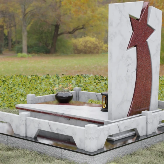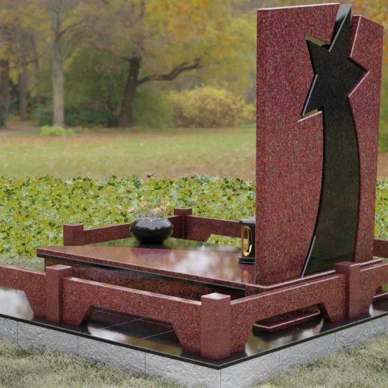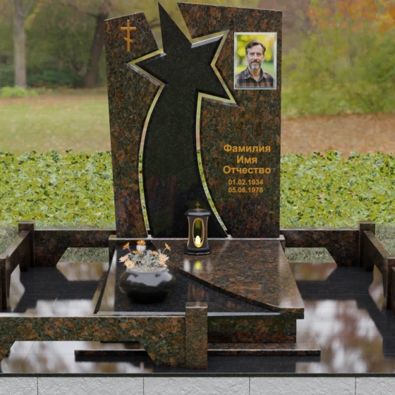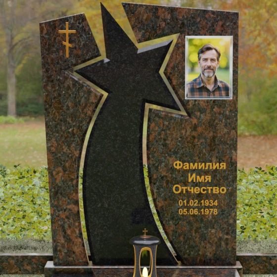 Форма этого мемориала наполнена глубокими смыслами. Центральный символ — звезда — традиционно олицетворяет путеводный свет, высокие достижения и бессмертие души. Для тех, чья жизнь была связана со служением отечеству, этот элемент подчеркивает их доблесть и профессиональный путь. В сочетании с православным крестом композиция говорит о единстве земного подвига и духовного упокоения. Плавные, дугообразные линии, обрамляющие центральную вставку, символизируют непрерывность времени и защиту, которую обретает душа в вечности. Асимметричная верхушка стелы подчеркивает индивидуальность и неповторимость жизненного пути человека.