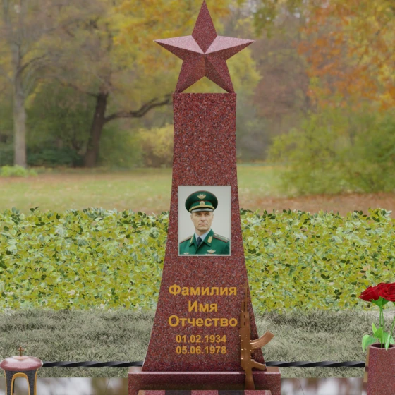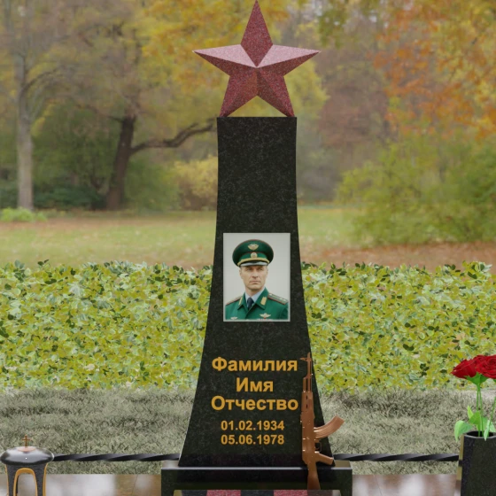 Мемориальный комплекс под артикулом 190 — это воплощение мужества, дисциплины и вечной памяти о человеке, чья жизнь была неразрывно связана с воинским долгом. Центральное место в композиции занимает высокая вертикальная стела, имеющая строгую, сужающуюся кверху геометрию. Такая форма выбрана неслучайно: она создает мощную визуальную вертикаль, направляющую взгляд зрителя ввысь, символизируя духовное восхождение и бессмертие подвига. Венчает монумент объемная пятиконечная звезда насыщенного красного цвета — символ чести и принадлежности к офицерскому корпусу. Одной из самых значимых и уникальных деталей данной модели является реалистично выполненная объемная фигура автомата Калашникова, прислоненного к боковой грани стелы. Этот элемент резьбы выполнен с безупречной точностью, подчеркивая профессиональный путь усопшего. Надгробие из натурального камня в таком исполнении выглядит величественно и бескомпромиссно, заявляя о силе характера того, кому оно посвящено.