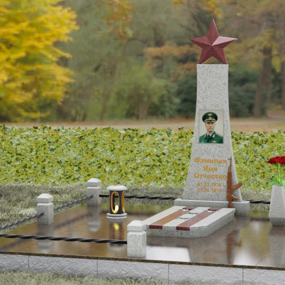 Портрет на данной модели традиционно выполняется в виде прямоугольной керамики или вставки в нишу, что позволяет сохранить фотографическую точность и яркость красок военного мундира на долгие годы. Расположение портрета на центральной оси стелы обеспечивает гармоничную композицию, где взгляд офицера обращен к приходящим. Этот памятник станет достойным финальным аккордом в истории жизни настоящего защитника, воплощая в холодном камне теплоту вашей любви и безграничную гордость за его путь.