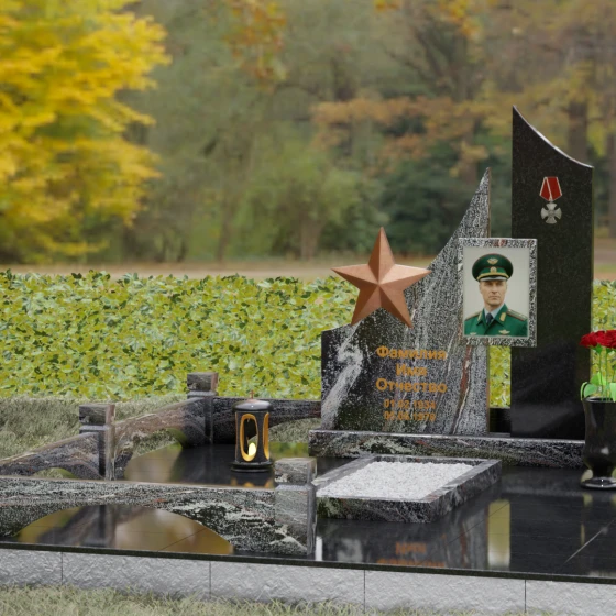 В основе художественной концепции лежит динамичная асимметрия, которая придает всей структуре современный, «европейский» облик. Центральная стела состоит из двух контрастных блоков, объединенных общим основанием. Левая часть, выполненная из темного полированного камня, имеет резкий диагональный срез, направленный вверх. На ее вершине закреплена объемная пятиконечная звезда с эффектом бронзового напыления — мощный акцент, подчеркивающий статус и заслуги покойного. Правая часть композиции представляет собой высокий вертикальный пилон из фактурного коричнево-красного гранита, на верхнем сегменте которого расположена детальная реплика ордена Мужества.