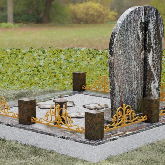 Данная модель предполагает целостное оформление места захоронения, превращая его в гармоничный архитектурный ансамбль. Основанием служит мощный гранитный цоколь, который не только обеспечивает устойчивость всей конструкции, но и четко очерчивает границы участка. По периметру установлены массивные каменные столбики, соединенные декоративным кованым ограждением, что создает атмосферу уединения и защищенности. В едином стиле с основным памятником выполнена надгробная плита и подставка, на которой размещаются дополнительные аксессуары: изящная каменная ваза для живых цветов и закрытая лампада из темного гранита, в которой будет теплиться огонек вечной памяти. Такое решение значительно упрощает уход за участком, сохраняя его аккуратный и достойный вид на долгие годы.