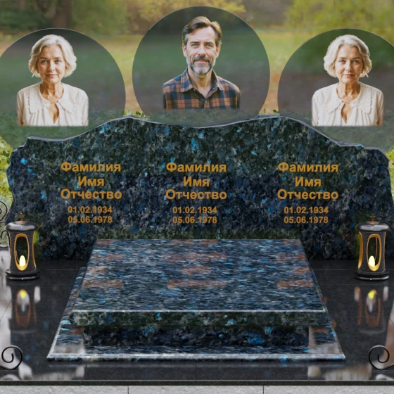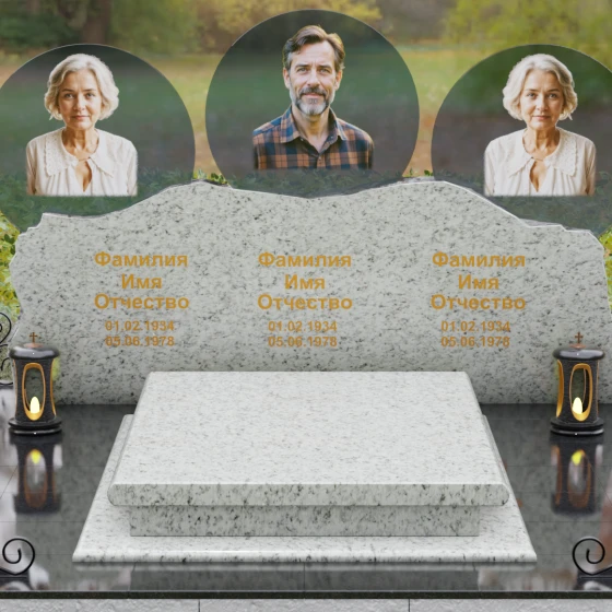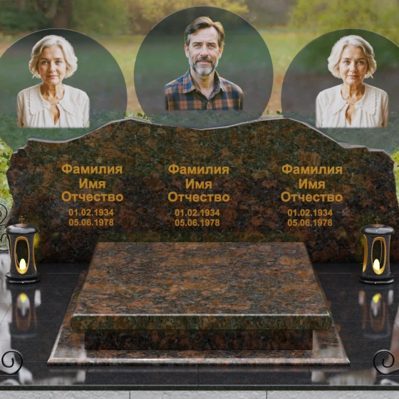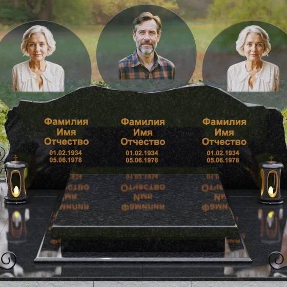 Этот гранитный монумент — истинное воплощение семейного единства, запечатленное в камне. Его горизонтальная архитектура, рассчитанная на три персоны, символизирует неразрывную связь поколений и вечный покой в лоне природы. Главной художественной доминантой выступает сложная геометрия верхней грани: вместо привычных строгих линий мы видим экспрессивный, «рваный» край, имитирующий очертания скалистых гор. Такая техника обработки, называемая «скала», создает мощный архетипический образ незыблемости и первозданной силы. Зеркальная полировка лицевой поверхности вступает в эффектный диалог с фактурным, необработанным верхним срезом, подчеркивая благородство материала. Три круглых медальона с портретами, словно три небесных светила, возвышаются над основным массивом, создавая ощущение легкости и устремленности ввысь, несмотря на монументальность конструкции. Золоченая гравировка имен выполнена глубоким академическим шрифтом, который мягко сияет при любом освещении, напоминая о внутреннем свете ушедших близких.