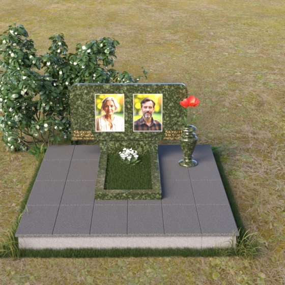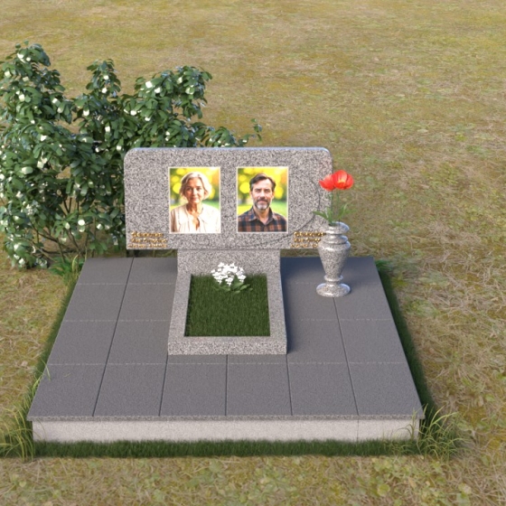Этот ритуальное изделие – воплощение сдержанной элегантности и глубокого уважения. Прямоугольная стела с мягко скругленными углами создает ощущение завершенности и покоя. Верхняя часть памятника, словно рамка для воспоминаний, украшена выгравированными портретами. Полированная поверхность камня, подобно зеркалу, отражает свет, создавая игру бликов и теней, что придает глубину и объем изображениям. Горизонтальная плита под портретами добавляет композиции устойчивости и визуально расширяет пространство. Все элементы памятника объединены лаконичным дизайном, который говорит о достоинстве и вечной памяти.