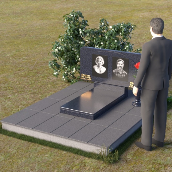 Форма стелы этого ритуального изделия идеально подходит для размещения двух портретов. Композиция с двумя изображениями, выполненными в технике гравировки, выглядит гармонично и сбалансированно. Под портретами можно расположить надпись с именем, датами жизни и короткой эпитафией. Золотое тиснение букв на черном граните создает эффект контраста и придает тексту дополнительную выразительность. Небольшая тумба, расположенная под стелой, служит подставкой для плиты с именами и годами жизни. Рядом с памятником можно установить вазу для цветов, выполненную в том же стиле и из того же материала, что и сам памятник. Это создаст единый ансамбль и подчеркнет целостность композиции. Дополнительно можно установить лампаду или небольшой фонарь, которые будут освещать памятник в темное время суток, создавая атмосферу умиротворения и светлой памяти.