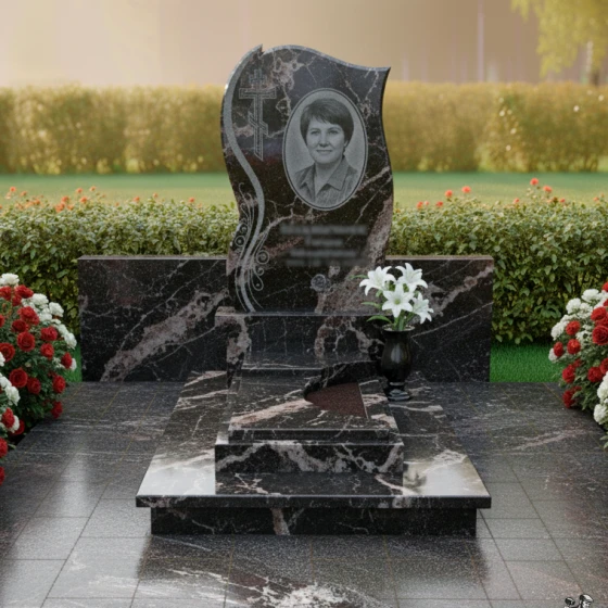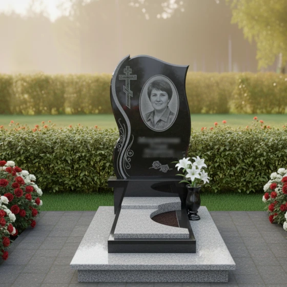 - Стела: Изогнутая форма с полированными краями и декоративными элементами в виде растительного орнамента, добавляющими изящество. В верхней части стелы расположен православный крест.