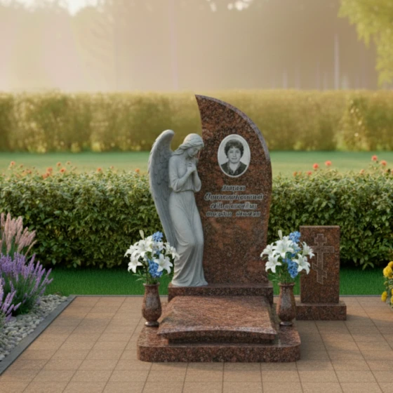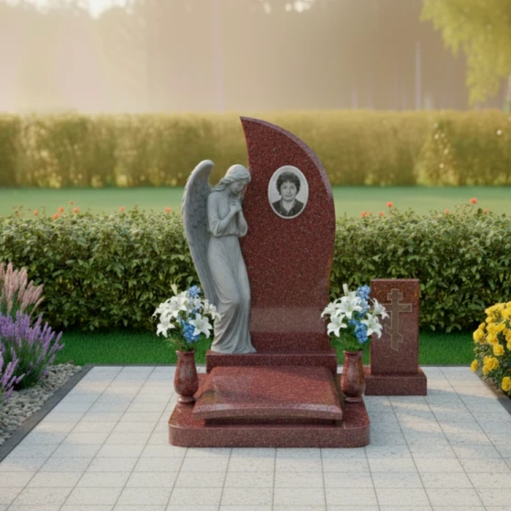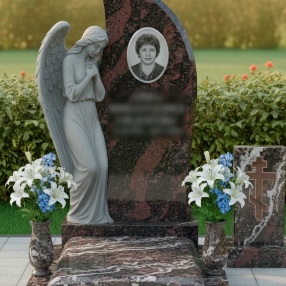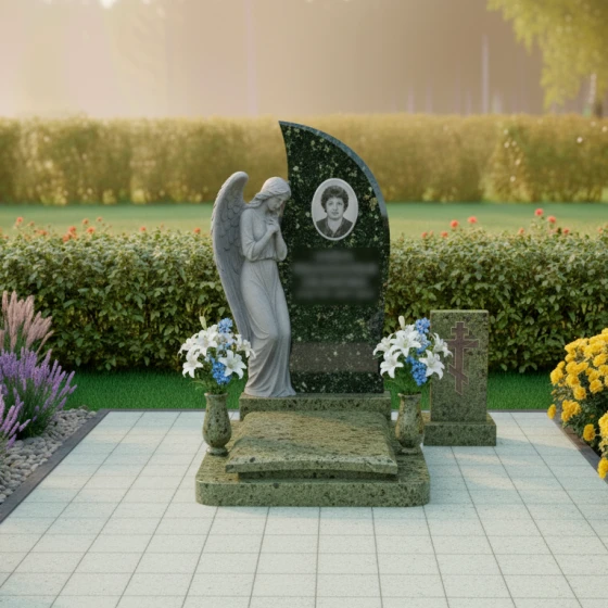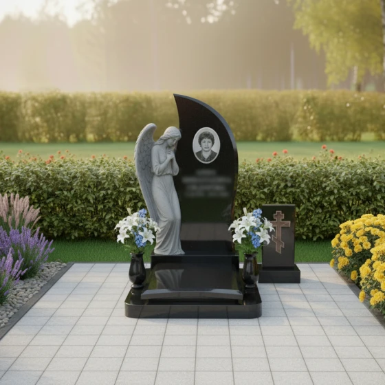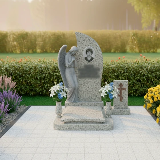 Этот мемориальный комплекс излучает тихую скорбь и надежду на небесное заступничество. Изогнутая форма стелы, словно крыло ангела, устремляется ввысь, символизируя вознесение души. Модель доступна в восьми вариантах исполнения - от строгого черного гранита до светлого мрамора Тассос - позволяя создать мемориал, наиболее точно отражающий личность усопшего и чувства близких.