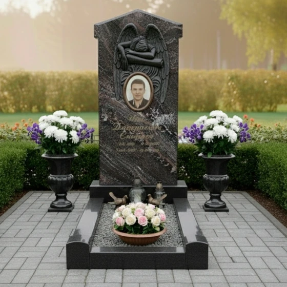 Эта мемориальная композиция отличается гармоничным сочетанием строгих линий и нежных, плавных изгибов, создающих ощущение умиротворения и вечного покоя. Центральным элементом является высокая, величественная стела, выполненная в форме прямоугольника с изящно скругленными верхними углами, что придает ей мягкость и утонченность. Верхняя часть стелы украшена объемным барельефом в виде распростертых крыльев ангела, бережно обнимающих пространство над портретом усопшего. Каждое перо крыльев тщательно проработано, создавая игру света и тени на матовой, бархатистой поверхности камня, в то время как основное поле стелы имеет глубокую, зеркальную полировку, отражающую небо и окружающий мир. В центре композиции, под крыльями, расположено овальное обрамление для фотографии, словно окошко в светлое прошлое, а под ним — гравировка имени и дат, выполненная с особой аккуратностью и почтением.