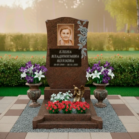 Благоустройство участка продумано до мелочей, создавая завершенный и ухоженный вид. Стела установлена на массивный, но при этом изящный гранитный цоколь, который надежно фиксирует конструкцию и придает ей устойчивость. Цоколь выполнен из черного гранита с тщательно отполированными гранями, что создает единый ансамбль со стелой. Надгробная плита, уложенная по всему периметру цоколя, выполнена из светлых гранитных плит, создающих контраст с основным камнем и облегчающих уход за местом захоронения. По периметру плиты уложена мелкая гранитная крошка, которая придает участку аккуратный и благородный вид. Композицию дополняют две массивные каменные вазы, расположенные по бокам от стелы. Их классическая форма и темный цвет идеально сочетаются с гранитом, а пышные букеты из фиолетовых и белых лилий, словно живые, привносят нотку свежести и нежности. В центре, перед стелой, размещена небольшая гранитная площадка, на которой установлена изящная бронзовая статуэтка ангела, склонившегося в молитве, и высажены яркие красные цветы, символизирующие вечную любовь и память.