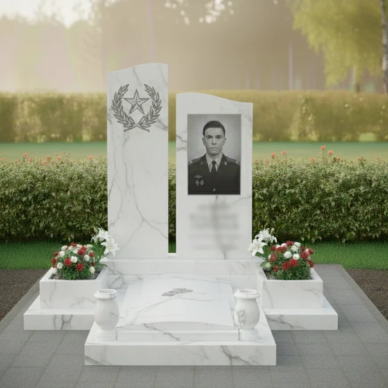Мемориальная композиция, представленная моделью ПН 305, является воплощением глубокого уважения и вечной памяти. Это не просто надгробное сооружение, а подлинное произведение искусства, созданное для того, чтобы достойно увековечить образ ушедшего человека. Центральная часть композиции — две вертикальные стелы, каждая из которых обладает уникальной формой и символическим значением. Левая стела, более высокая и строгая, имеет плавную, волнообразную верхнюю грань, словно устремленную ввысь, к небесам. Ее безупречно отполированная до зеркального блеска черная поверхность служит идеальным фоном для тонкой гравировки, изображающей лавровый венок, обрамляющий пятиконечную звезду. Этот элемент придает композиции торжественность и символизирует доблесть и заслуги. Правая стела, чуть ниже, но не менее значимая, представляет собой строгий прямоугольник с идеально ровными, четко очерченными гранями. Ее лицевая сторона также обладает глубоким черным глянцем, создающим эффект бездонного пространства, на котором особенно выразительно смотрится портрет.
