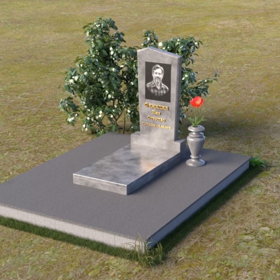 Этот гранитный монумент представляет собой композицию из двух основных элементов: вертикальной плиты с портретом и горизонтальной накладки. Вертикальная плита, возвышающаяся над землей, имеет строгую прямоугольную форму с небольшим скосом в верхней части. Это придает монументу сдержанную элегантность. Зеркальная полировка поверхности отражает свет, создавая ощущение глубины и сияния. На плите выгравирован портрет усопшего, выполненный с высокой точностью и вниманием к деталям. Ниже портрета располагается надпись с именем и датами жизни, выполненная золотым шрифтом. Горизонтальная накладка, расположенная в нижней части, также выполнена из черного полированного гранита и служит своеобразным пьедесталом для вертикальной плиты. Ее гладкая поверхность создает дополнительный контраст с окружающей средой. Рядом с монументом установлена ваза из черного гранита, предназначенная для живых цветов.
