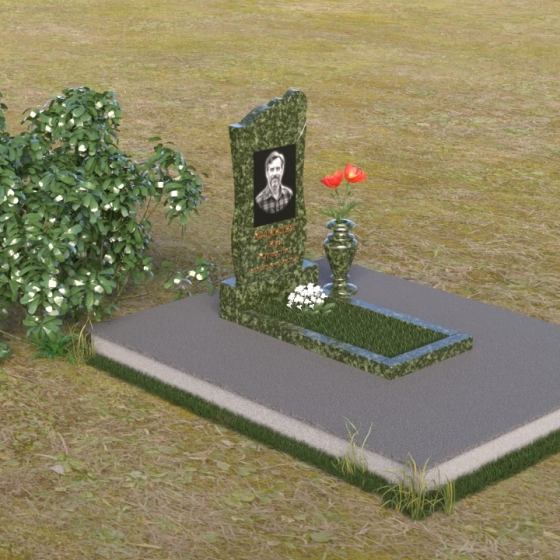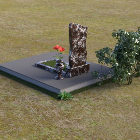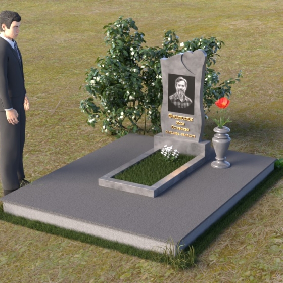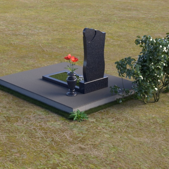Дополнительным элементом композиции служит горизонтальная плита, выполненная из того же материала, что и стела. Она создает ощущение устойчивости и надежности, подчеркивая монументальность сооружения. На эту плиту можно возложить цветы или установить лампадку, чтобы почтить память усопшего. Рядом со стелой установлена небольшая ваза из черного гранита, предназначенная для живых цветов. Ее классическая форма и строгие линии гармонично дополняют общий стиль памятника.