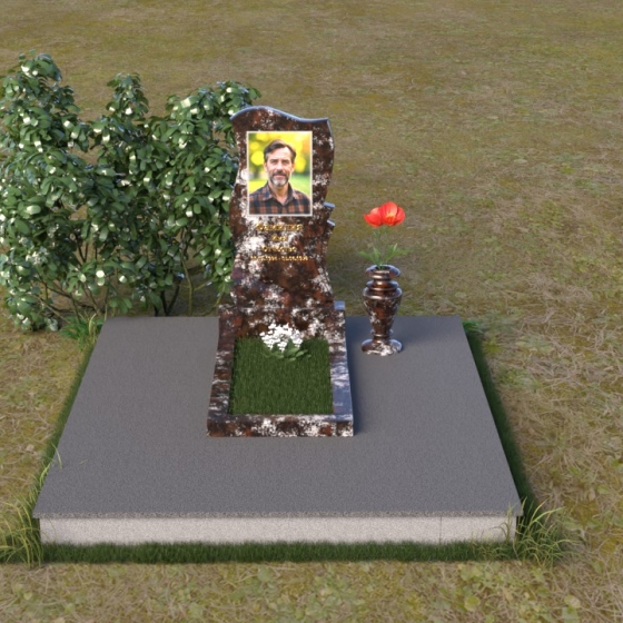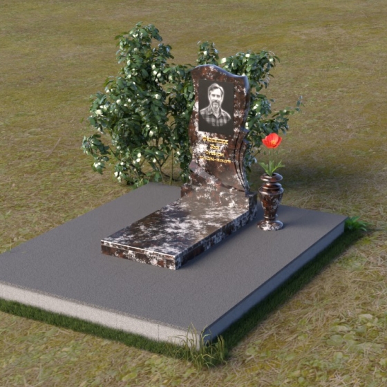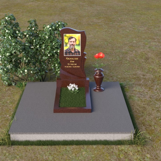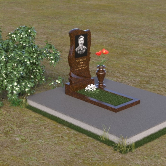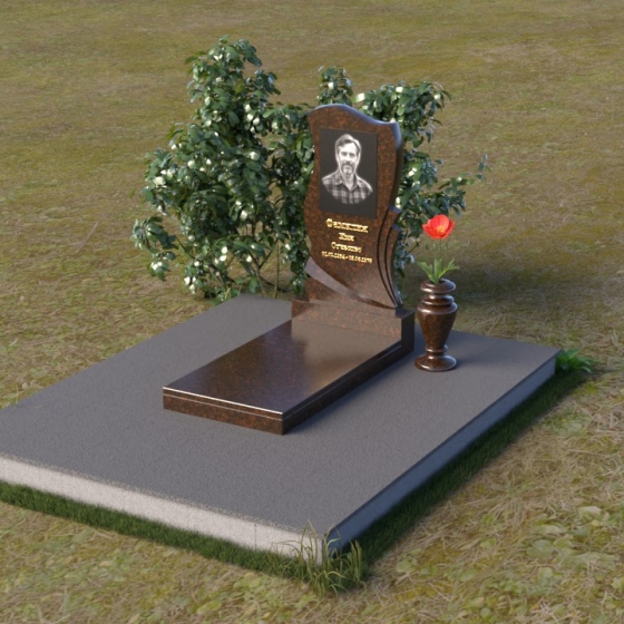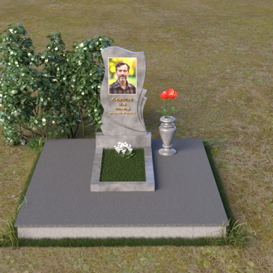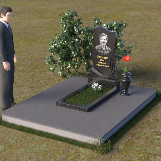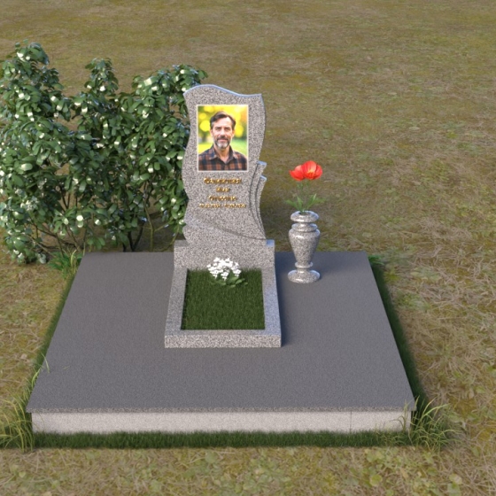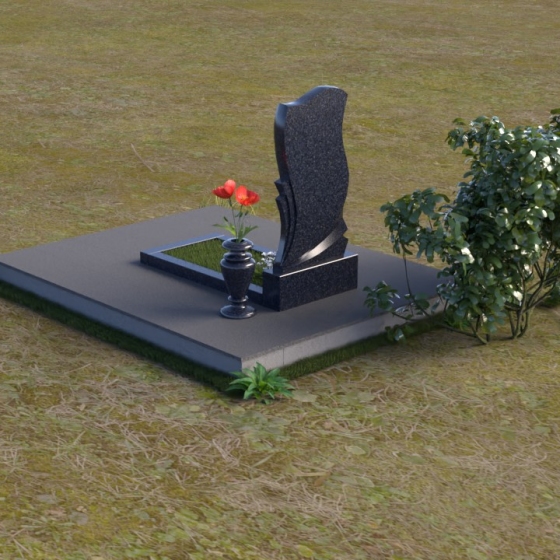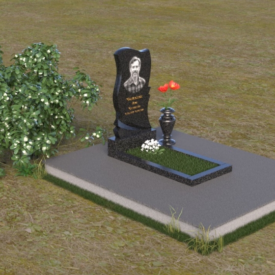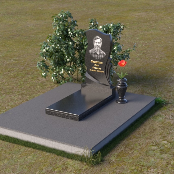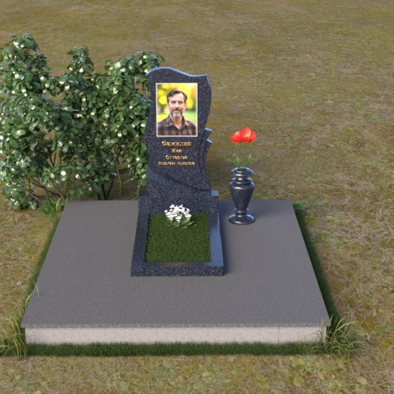 Волнообразная форма стелы предоставляет широкие возможности для размещения портрета и памятной надписи. Фотография усопшего, расположенная в верхней части стелы, будет выглядеть особенно выразительно на фоне полированного камня. Изящная надпись, выполненная методом гравировки, подчеркнет индивидуальность и неповторимость личности. Можно добавить декоративные элементы: изображение цветов, таких как роза, символизирующих любовь и вечную память, или других символов, близких сердцу усопшего. Ваза, изящно дополняющая композицию, может быть наполнена свежими цветами, создавая атмосферу умиротворения и светлой печали. Темный цвет камня создает благородный контраст с яркостью живых цветов, помещенных в вазу.